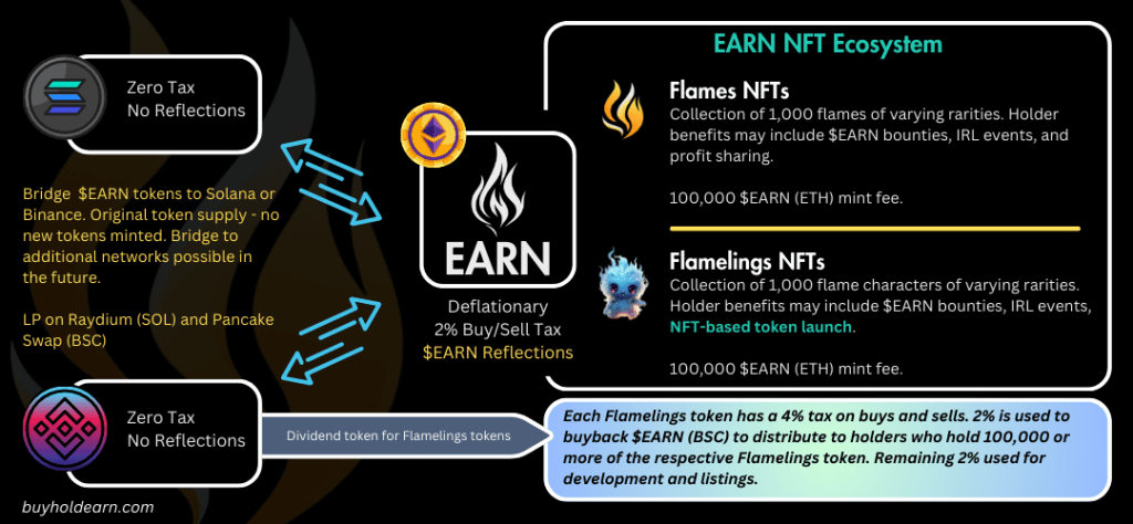 In the past six weeks, EARN has launched three dividend tokens associated with minted Flamelings. The first was 0x13, named after Flameling #13. 0x13 was followed by 0x21 and the latest, 0x159. All three tokens are on BSC and are taxed at a rate of 4% on buys and sells – 2% going to buy and distribute BSC $EARN to Flamelings token holders with 100,000 or more tokens in their wallet, and the remaining 2% to development, marketing and liquidity. Owners of the NFTs associated with the tokens have taken it upon themselves, with support of the EARN team, to see that their associated token is a success. This model is in its infancy, but community members liken it to owning a piece of the EARN franchise, with everything pointing back to buying $EARN.